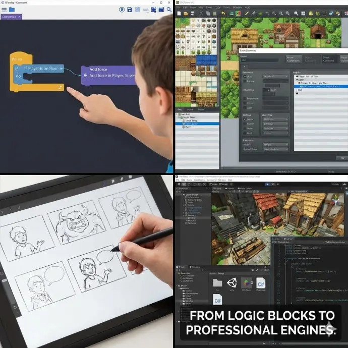 Our students progress through different tiers of game design. Starting with GDevelop to master event-based logic, they move into RPG Maker MZ/Unite for world-building and narrative design. Finally, they transition to Unity 2D, where they write C# scripts to create complex, multi-layered RPG experiences.
